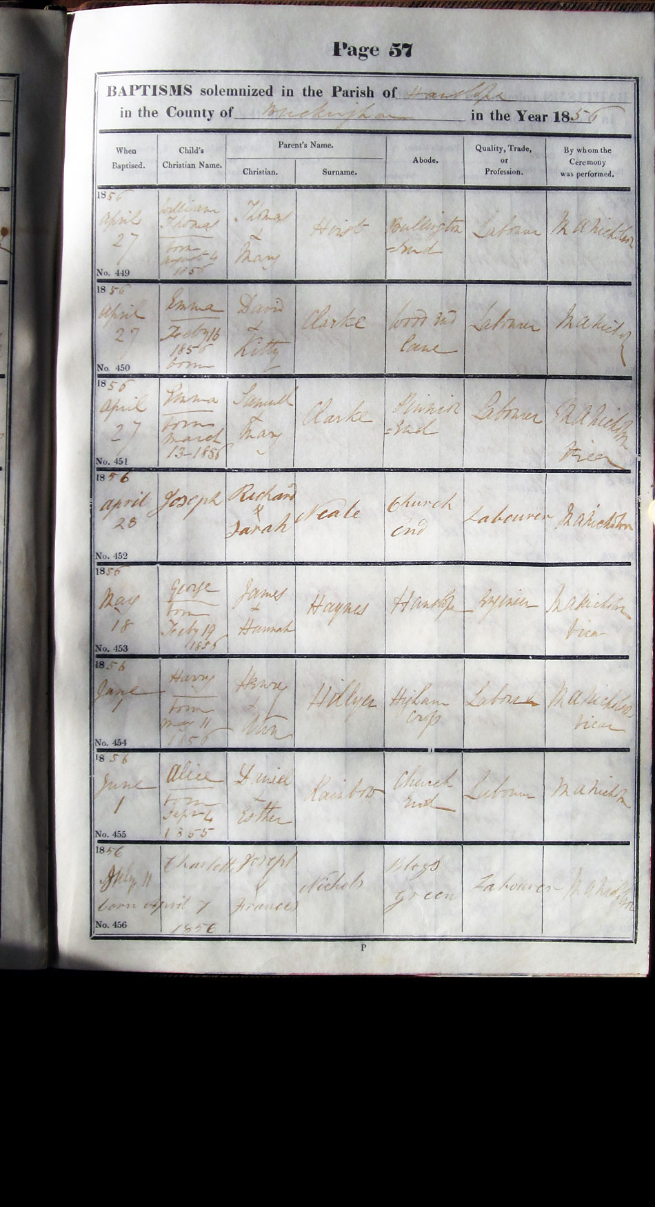 Below is a transcription and image of page 57 of the Baptism register for 1846-1863 of St. James The Great, Hanslope |