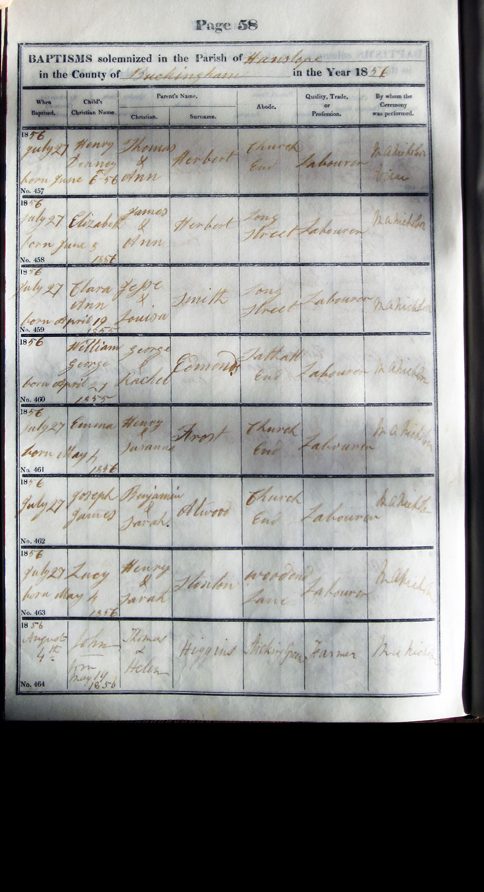Below is a transcription and image of page 58 of the Baptism register for 1846-1863 of St. James The Great, Hanslope |