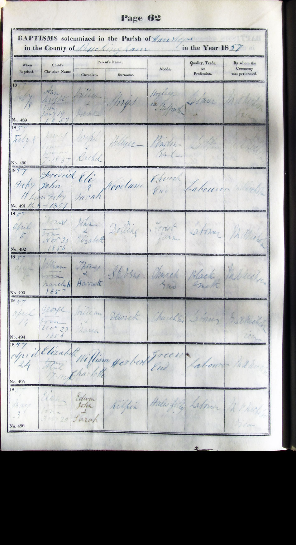 Below is a transcription and image of page 62 of the Baptism register for 1846-1863 of St. James The Great, Hanslope |