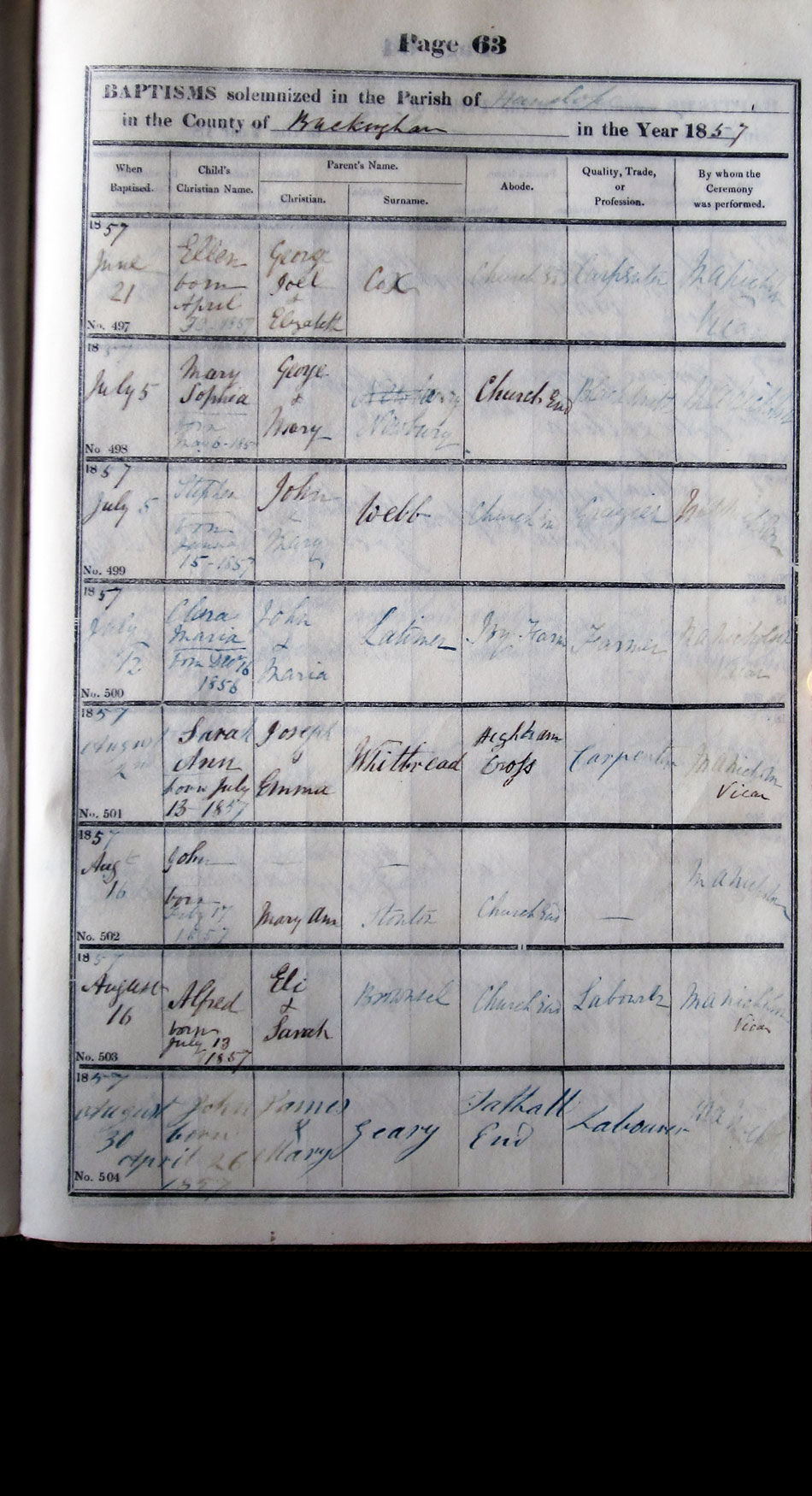 Below is a transcription and image of page 63 of the Baptism register for 1846-1863 of St. James The Great, Hanslope |