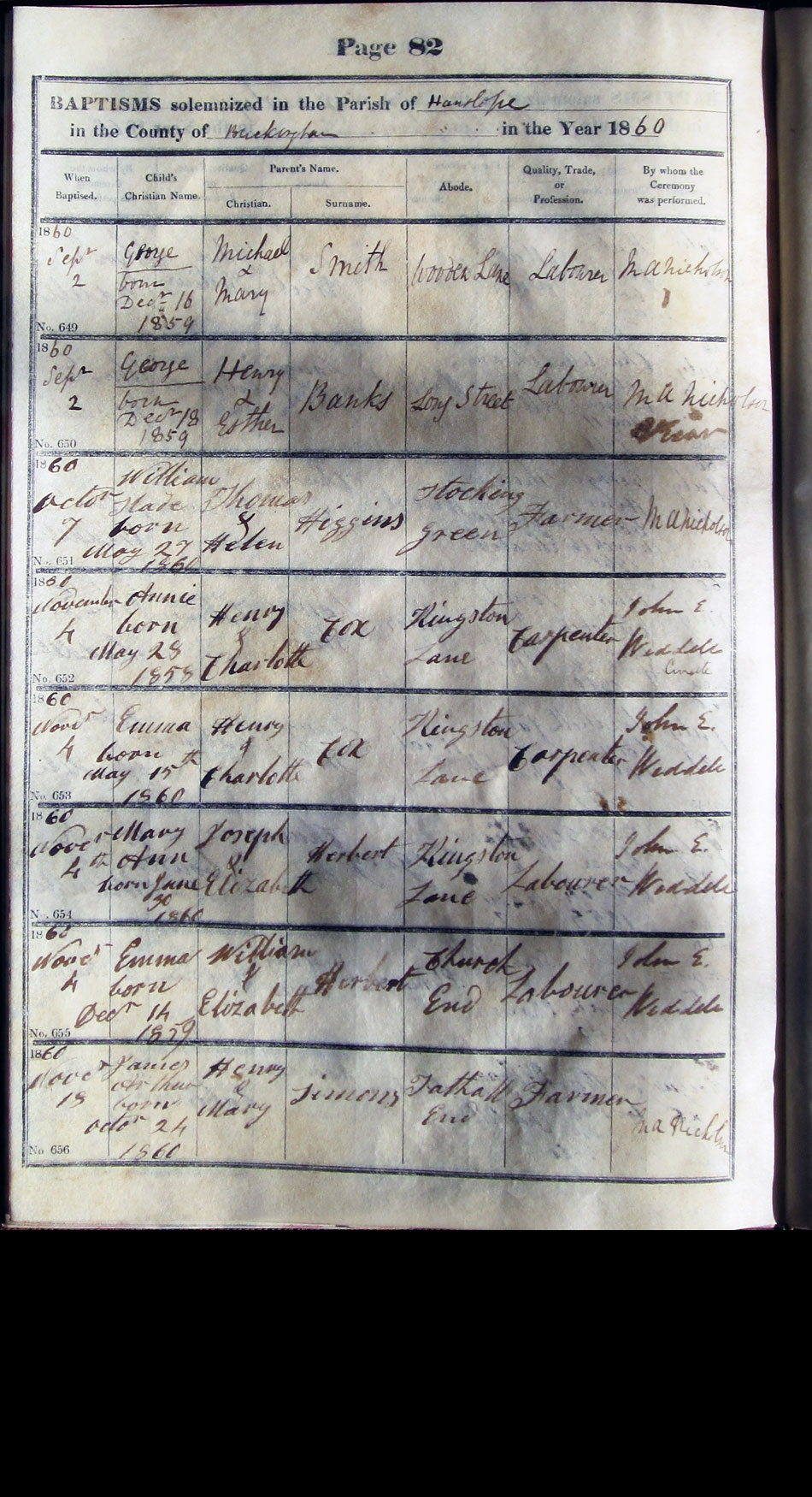 Below is a transcription and image of page 82 of the Baptism register for 1846-1863 of St. James The Great, Hanslope