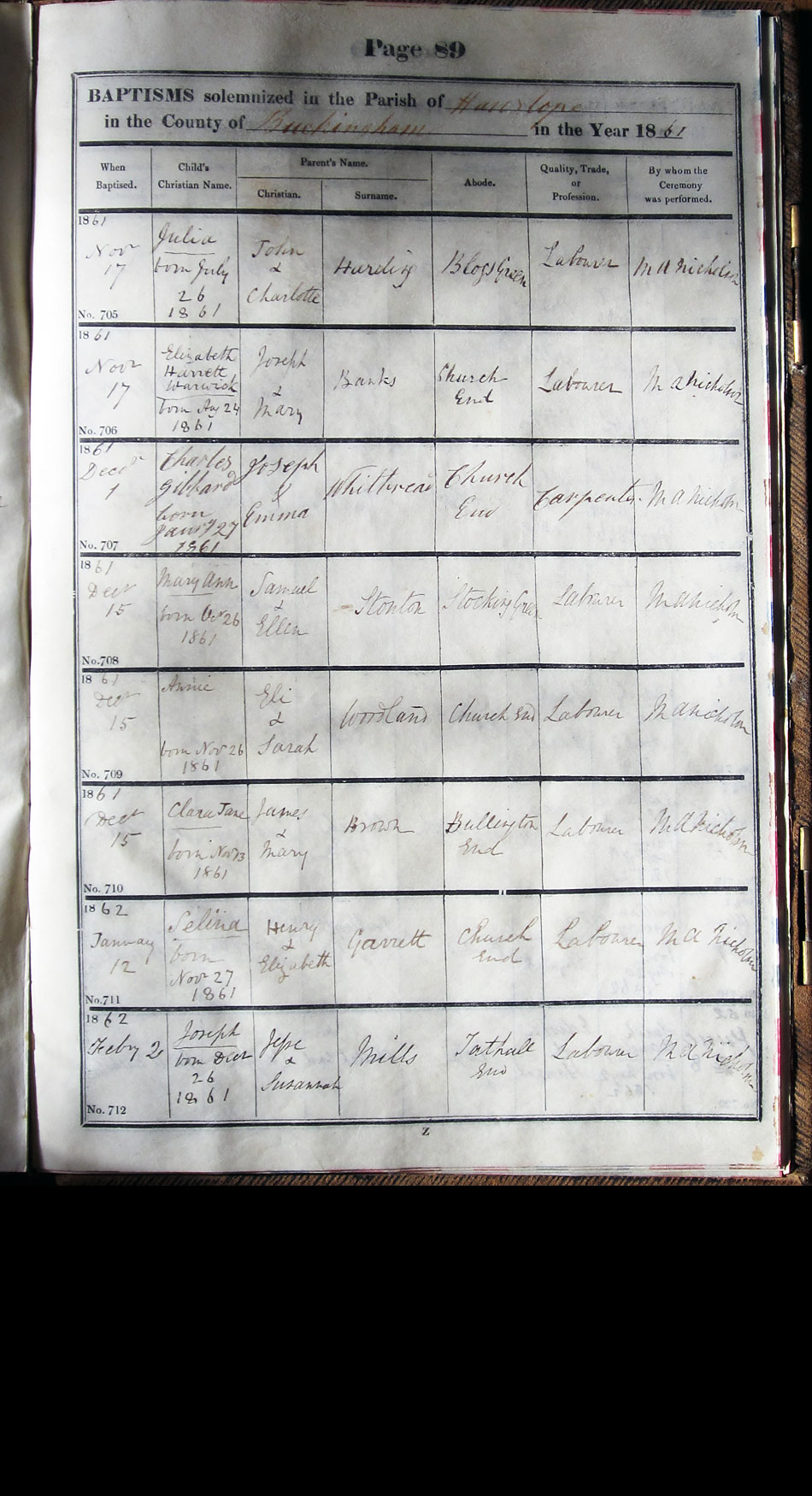 Below is a transcription and image of page 89 of the Baptism register for 1846-1863 of St. James The Great, Hanslope |