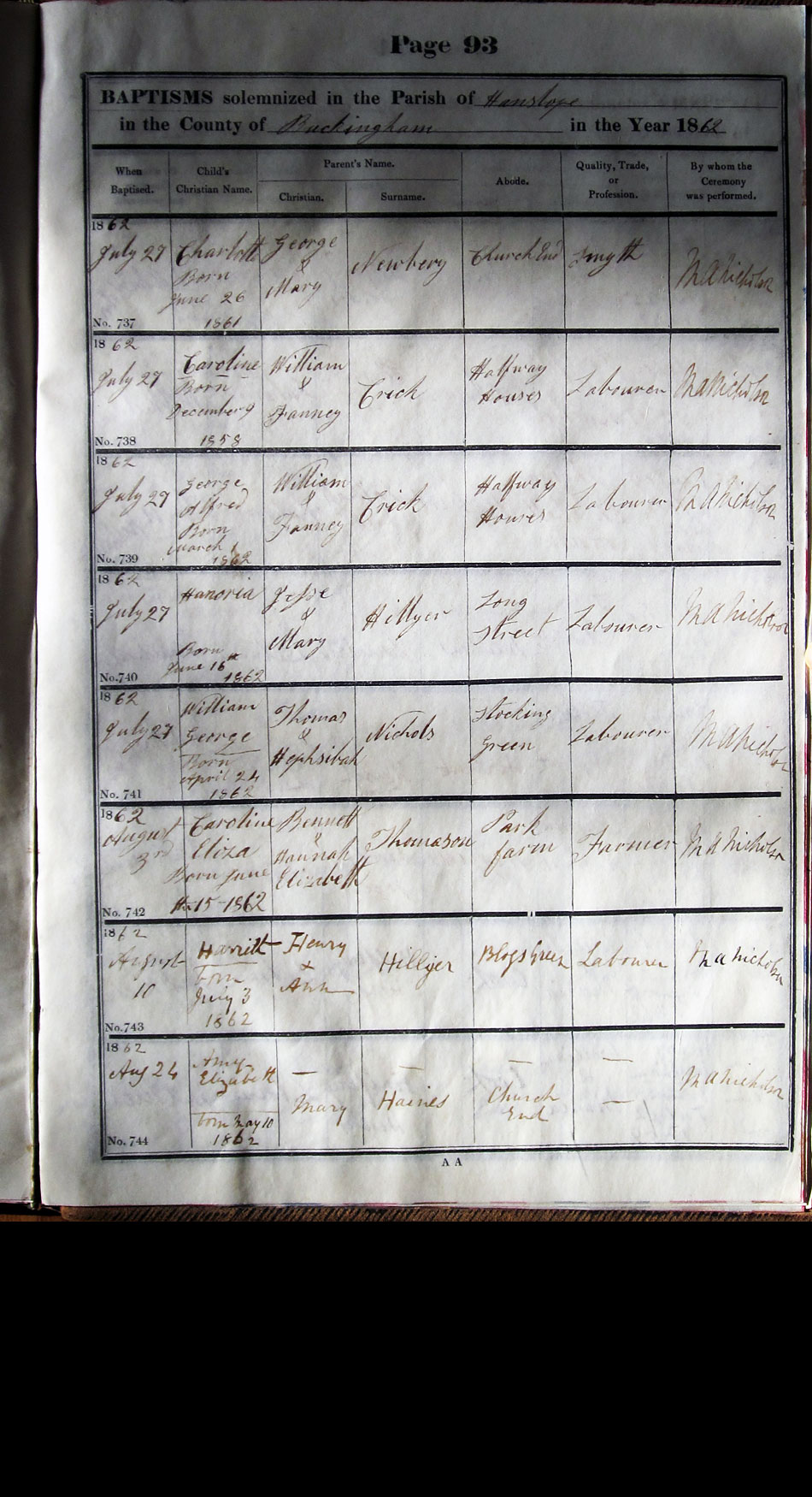 Below is a transcription and image of page 93 of the Baptism register for 1846-1863 of St. James The Great, Hanslope |