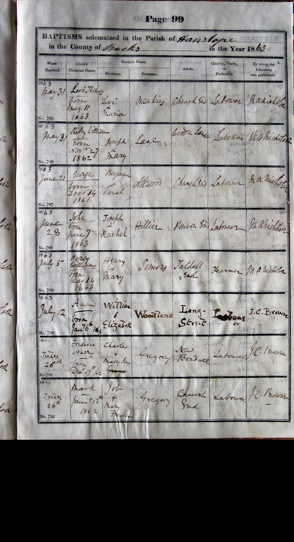 Below is a transcription and image of page 99 of the Baptism register for 1846-1863 of St. James The Great, Hanslope |