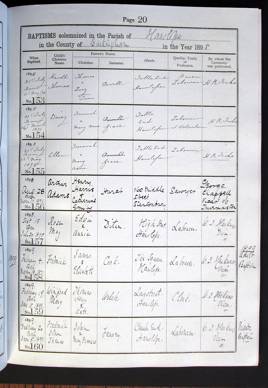 Below is a transcription and image of page 20 of the Baptism register for 1893-1928 of St. James The Great, Hanslope