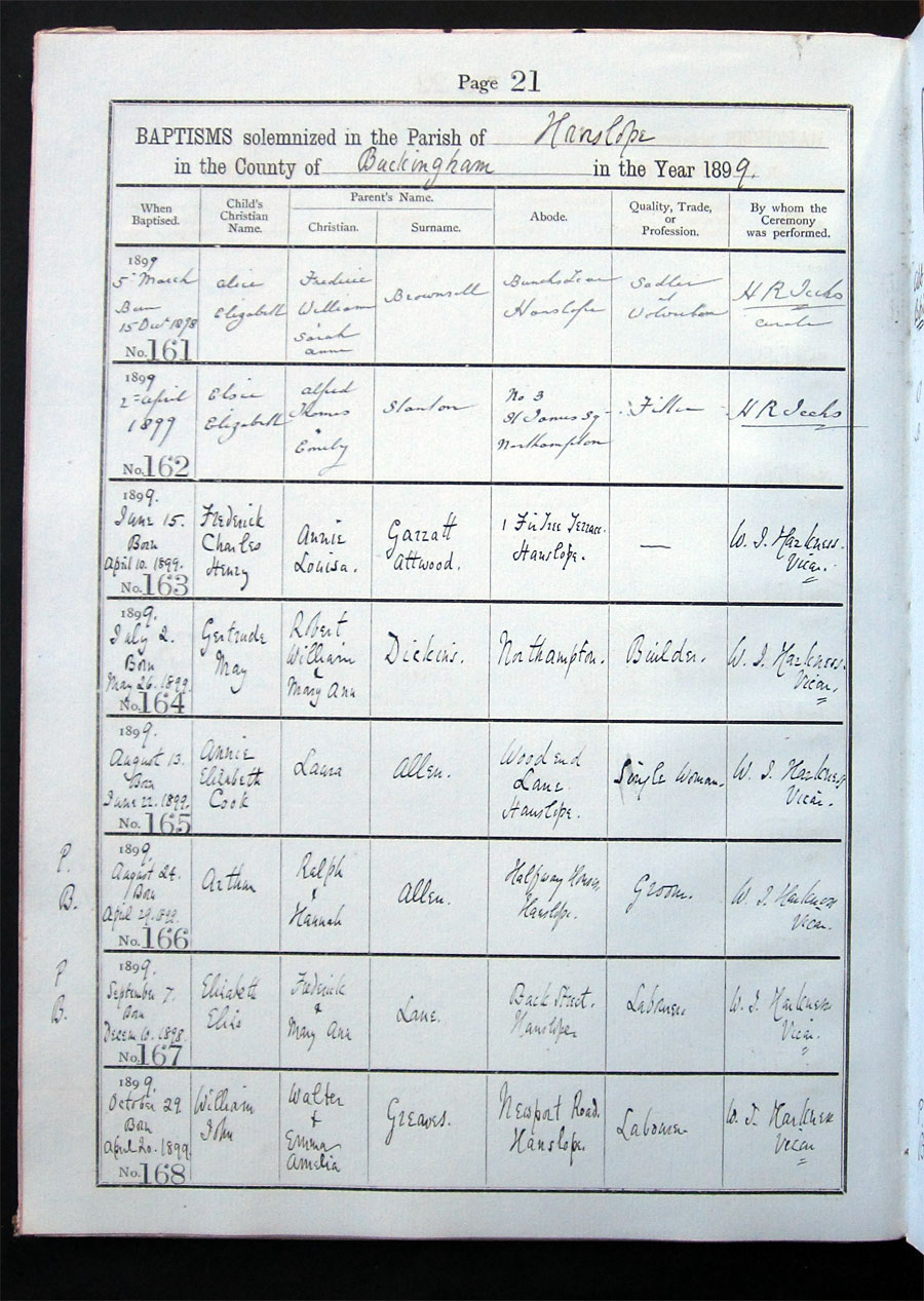 Below is a transcription and image of page 21 of the Baptism register for 1893-1928 of St. James The Great, Hanslope
