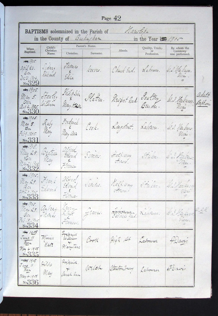 Below is a transcription and image of page 42 of the Baptism register for 1893-1928 of St. James The Great, Hanslope