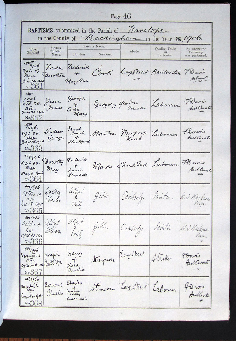 Below is a transcription and image of page 46 of the Baptism register for 1893-1928 of St. James The Great, Hanslope |