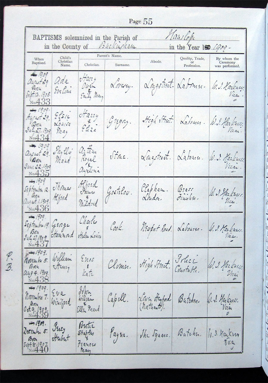 Below is a transcription and image of page 55 of the Baptism register for 1893-1928 of St. James The Great, Hanslope |