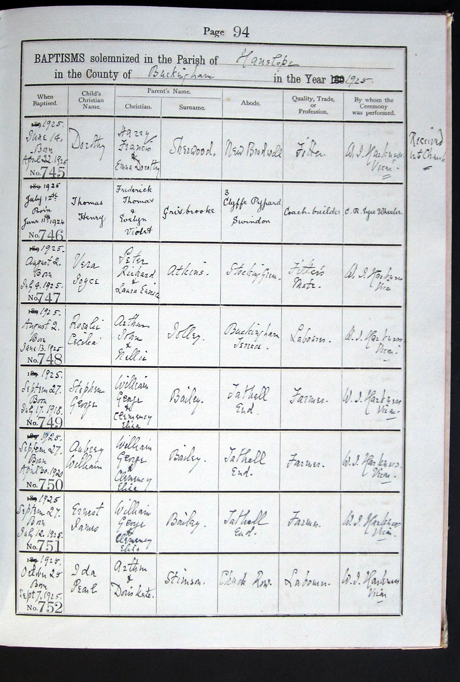 Below is a transcription and image of page 94 of the Baptism register for 1893-1928 of St. James The Great, Hanslope