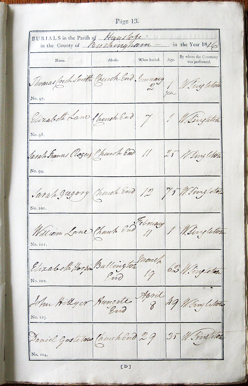 Below is a transcription and image of page 13 of the Burial register for 1813-1852 of St. James The Great, Hanslope |