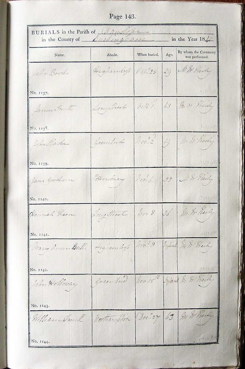 Below is a transcription and image of page 143 of the Burial register for 1813-1852 of St. James The Great, Hanslope |