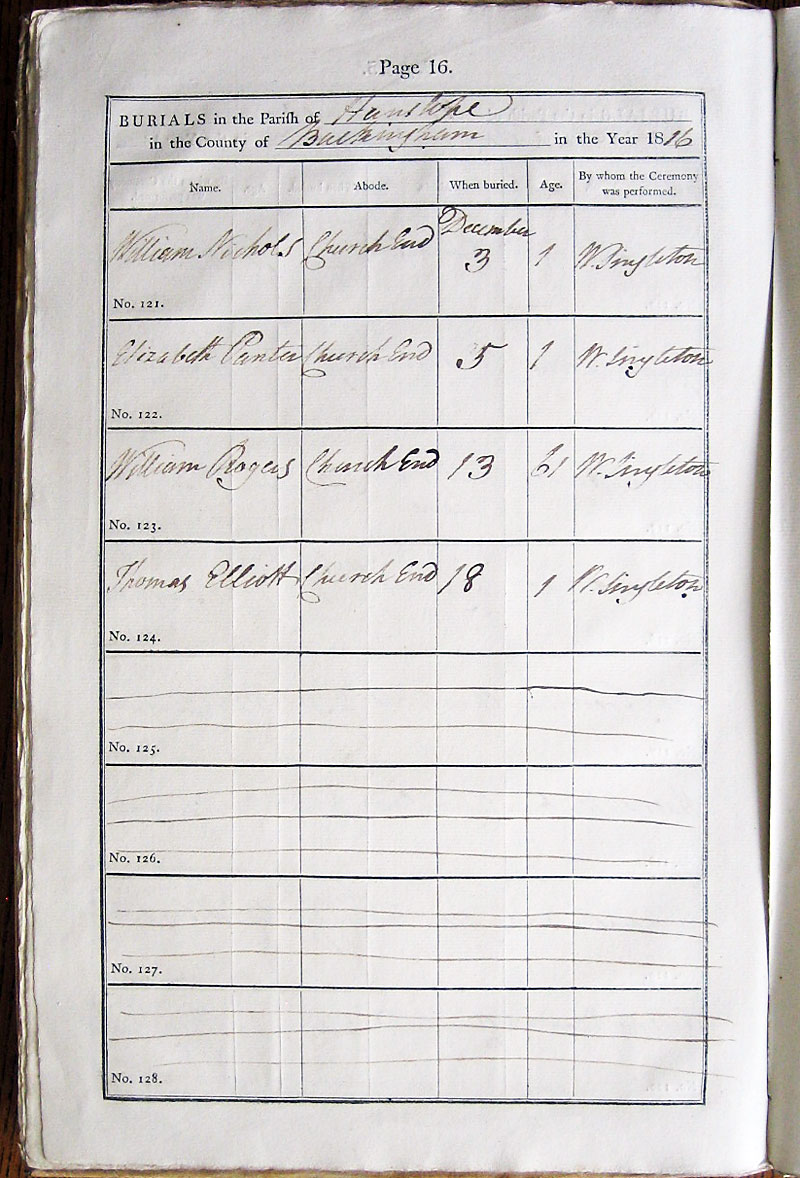 Below is a transcription and image of page 16 of the Burial register for 1813-1852 of St. James The Great, Hanslope |