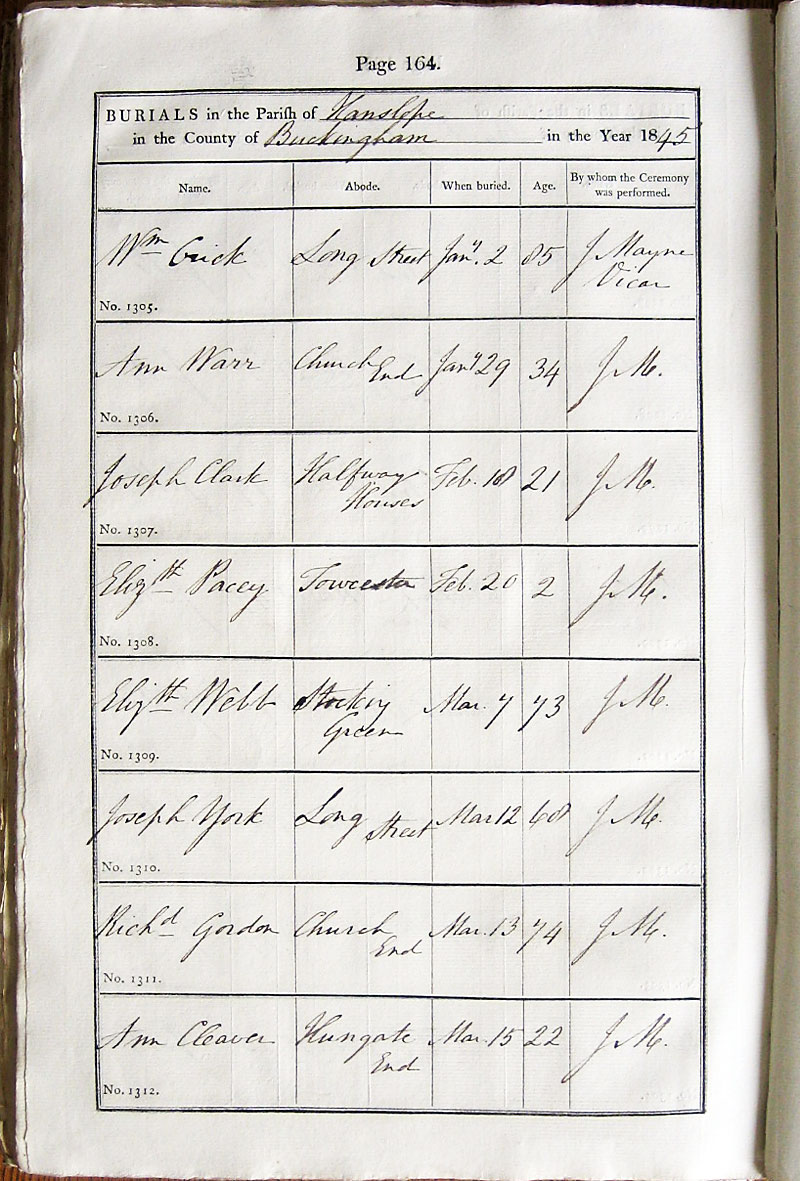 Below is a transcription and image of page 164 of the Burial register for 1813-1852 of St. James The Great, Hanslope |