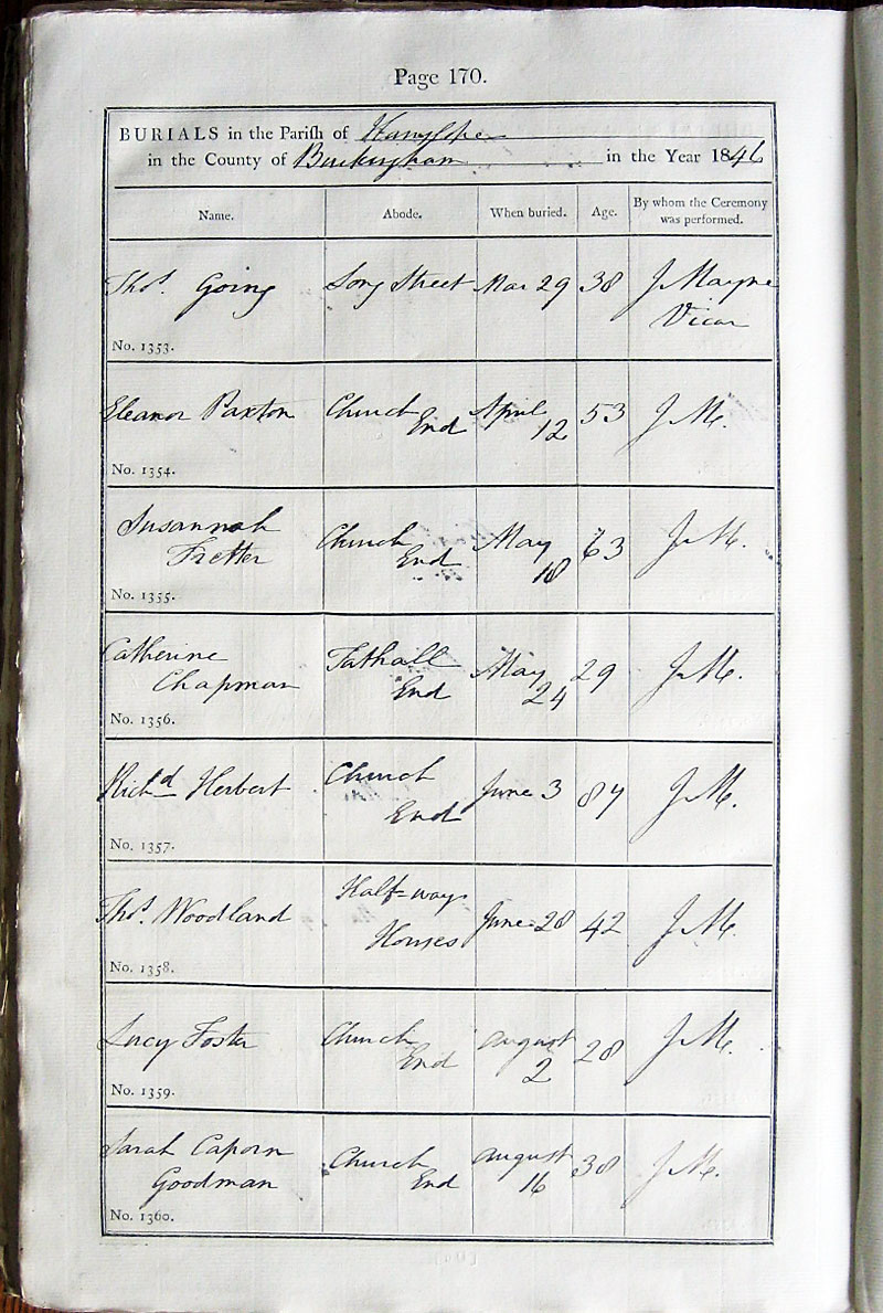 Below is a transcription and image of page 170 of the Burial register for 1813-1852 of St. James The Great, Hanslope |