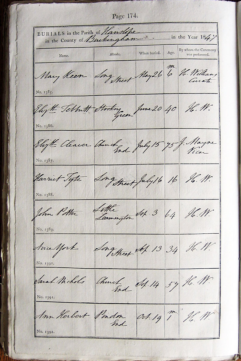 Below is a transcription and image of page 174 of the Burial register for 1813-1852 of St. James The Great, Hanslope |