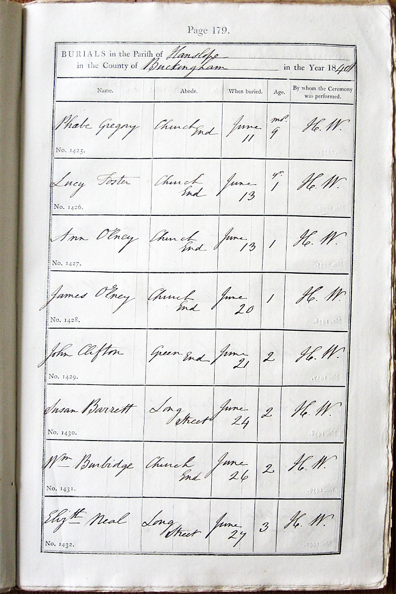Below is a transcription and image of page 179 of the Burial register for 1813-1852 of St. James The Great, Hanslope |