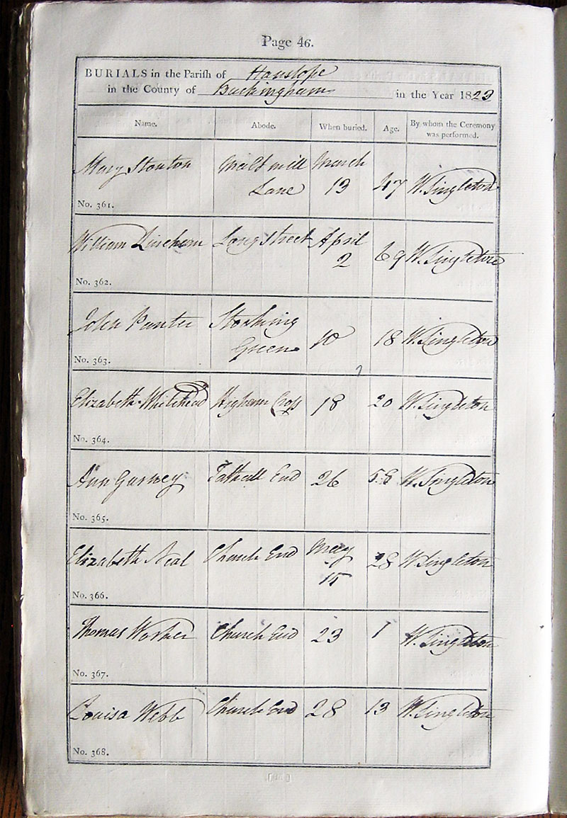 Below is a transcription and image of page 46 of the Burial register for 1813-1852 of St. James The Great, Hanslope |
