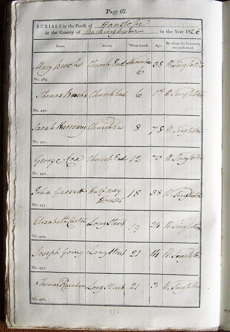 Below is a transcription and image of page 62 of the Burial register for 1813-1852 of St. James The Great, Hanslope |