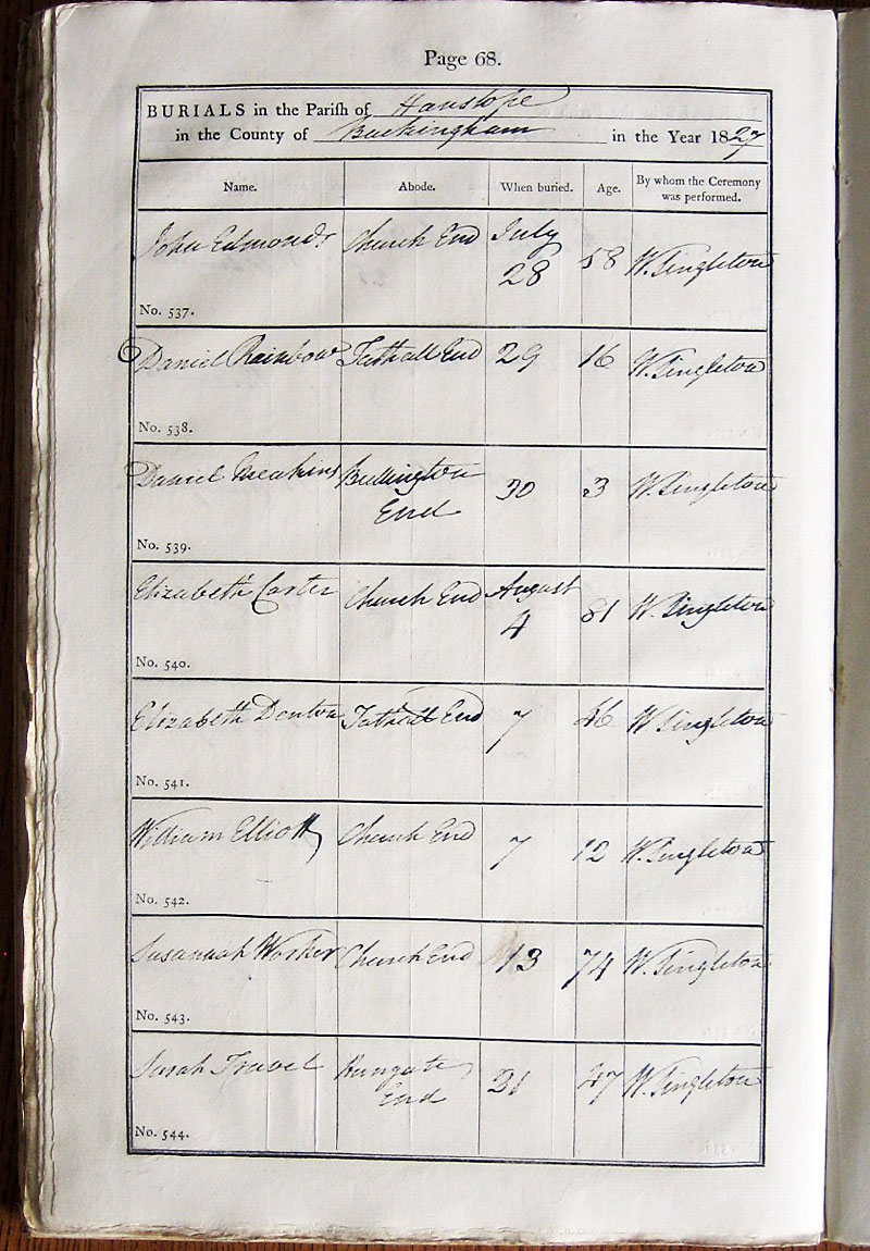 Below is a transcription and image of page 68 of the Burial register for 1813-1852 of St. James The Great, Hanslope |