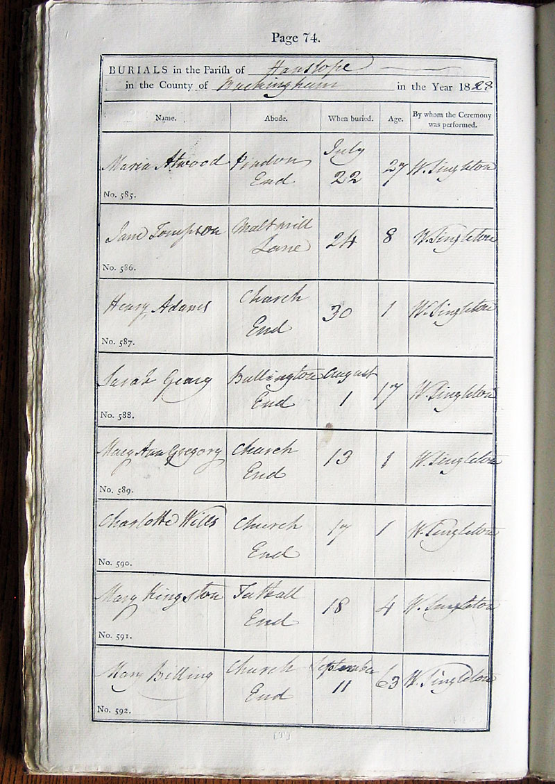 Below is a transcription and image of page 74 of the Burial register for 1813-1852 of St. James The Great, Hanslope |