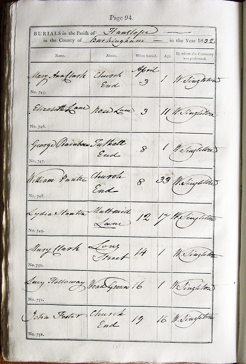 Below is a transcription and image of page 94 of the Burial register for 1813-1852 of St. James The Great, Hanslope |