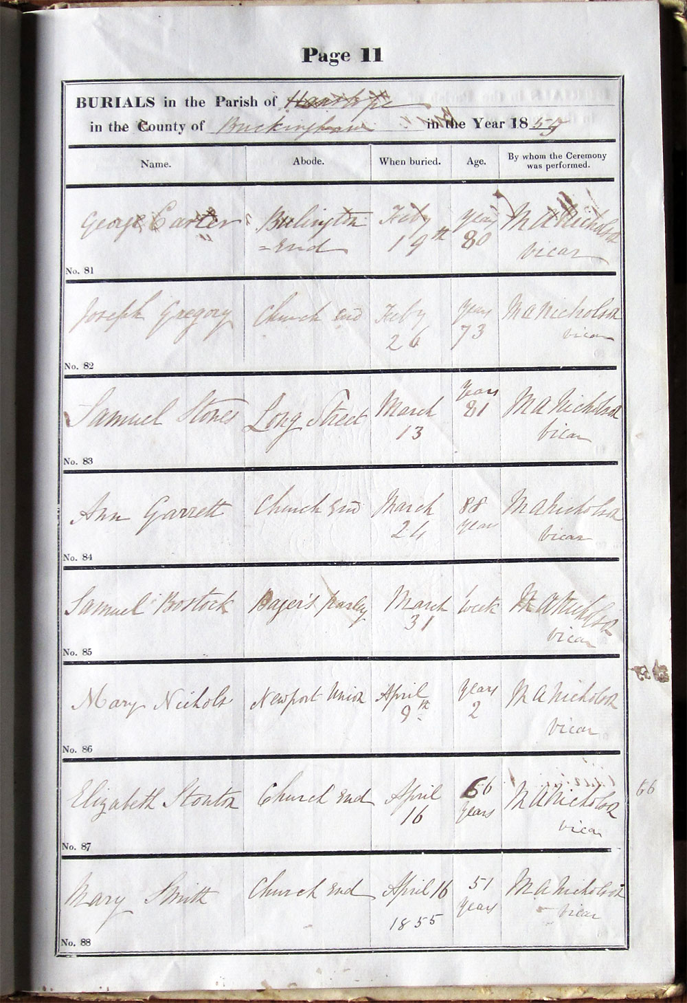 Below is a transcription and image of page 11 of the Burial register for 1853-1878 of St. James The Great, Hanslope |