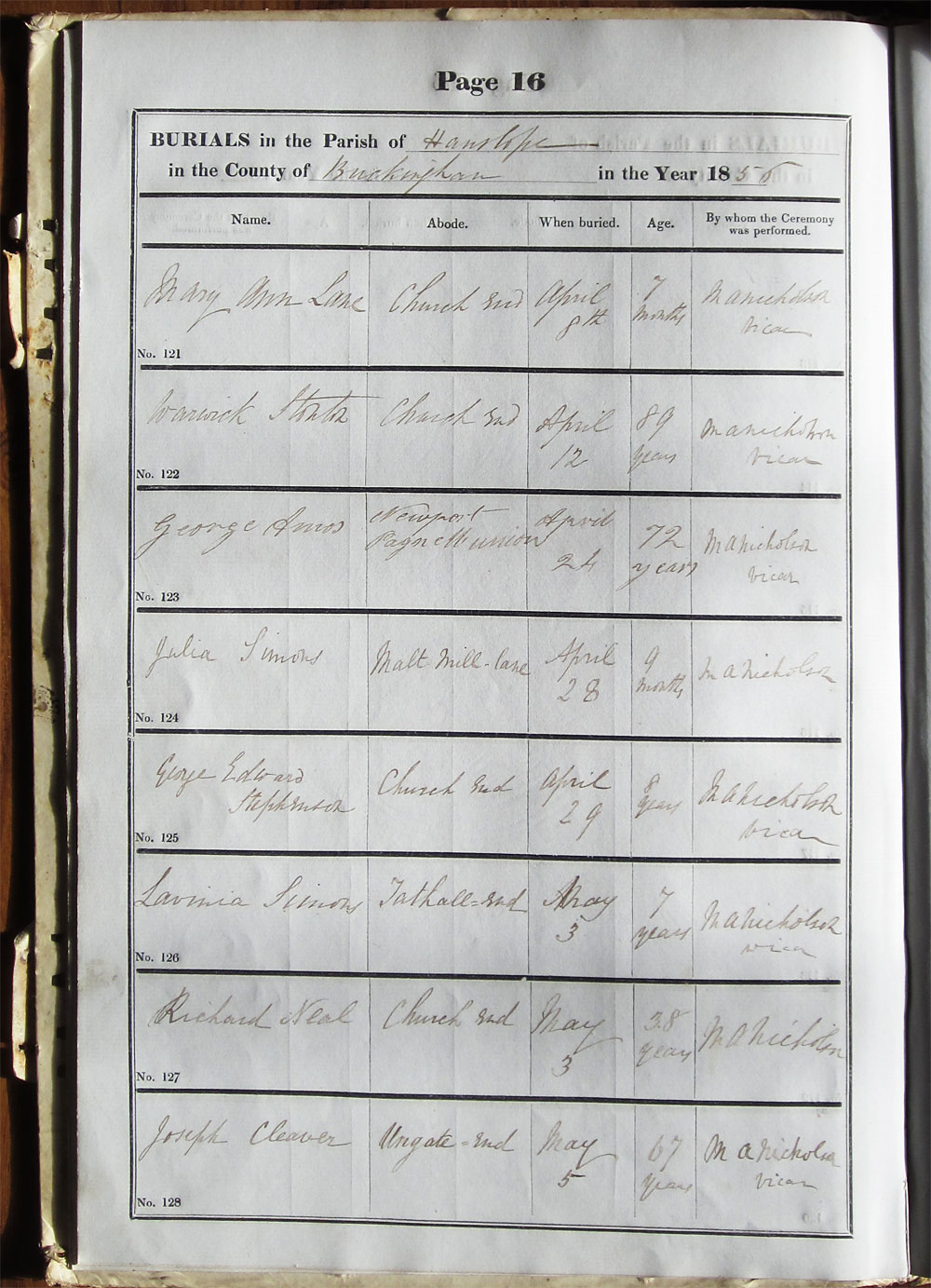 Below is a transcription and image of page 16 of the Burial register for 1853-1878 of St. James The Great, Hanslope |