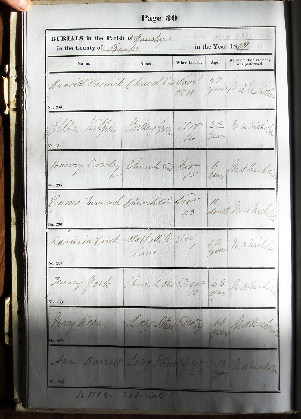 Below is a transcription and image of page 30 of the Burial register for 1853-1878 of St. James The Great, Hanslope |