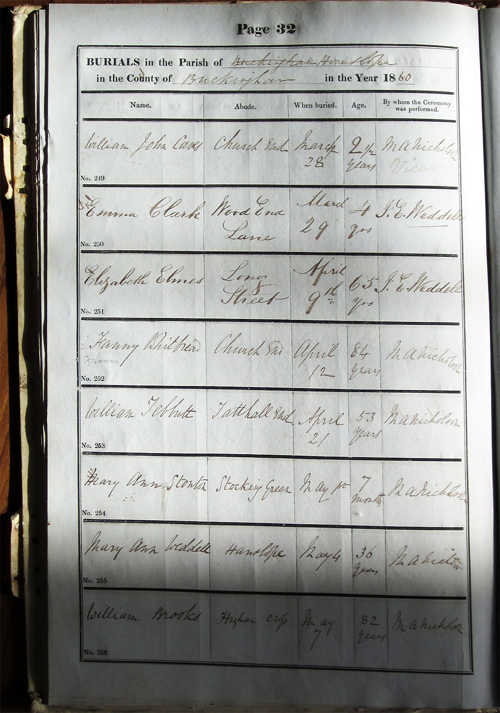 Below is a transcription and image of page 32 of the Burial register for 1853-1878 of St. James The Great, Hanslope |
