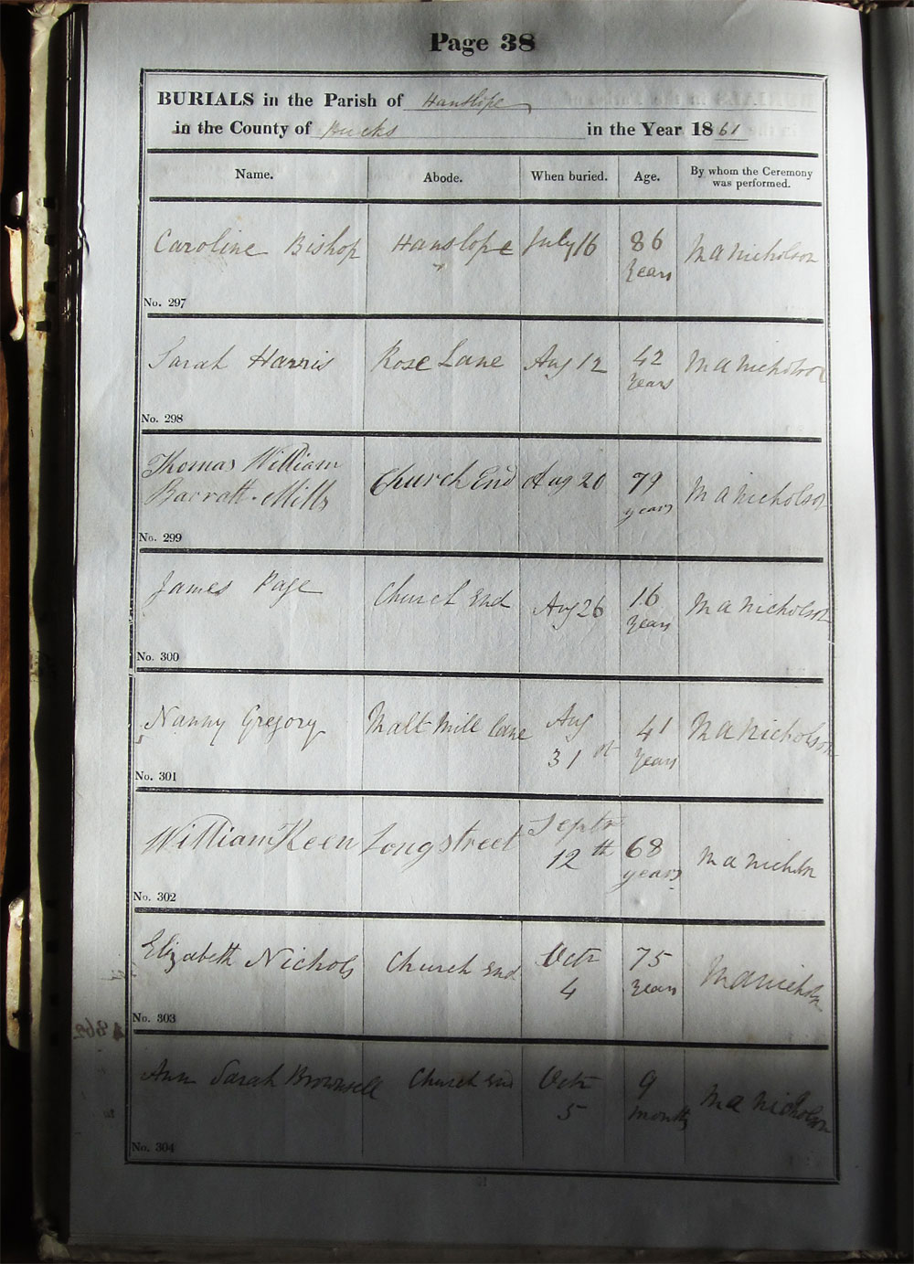 Below is a transcription and image of page 38 of the Burial register for 1853-1878 of St. James The Great, Hanslope |