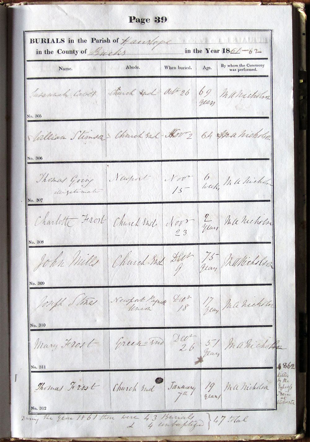Below is a transcription and image of page 39 of the Burial register for 1853-1878 of St. James The Great, Hanslope |