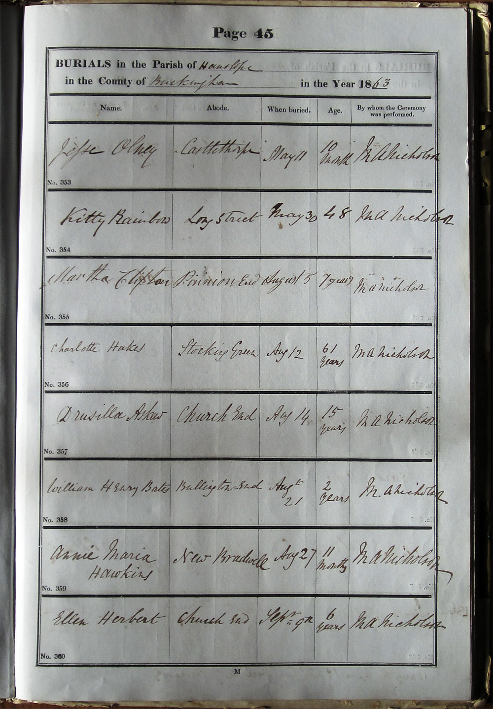 Below is a transcription and image of page 45 of the Burial register for 1853-1878 of St. James The Great, Hanslope |