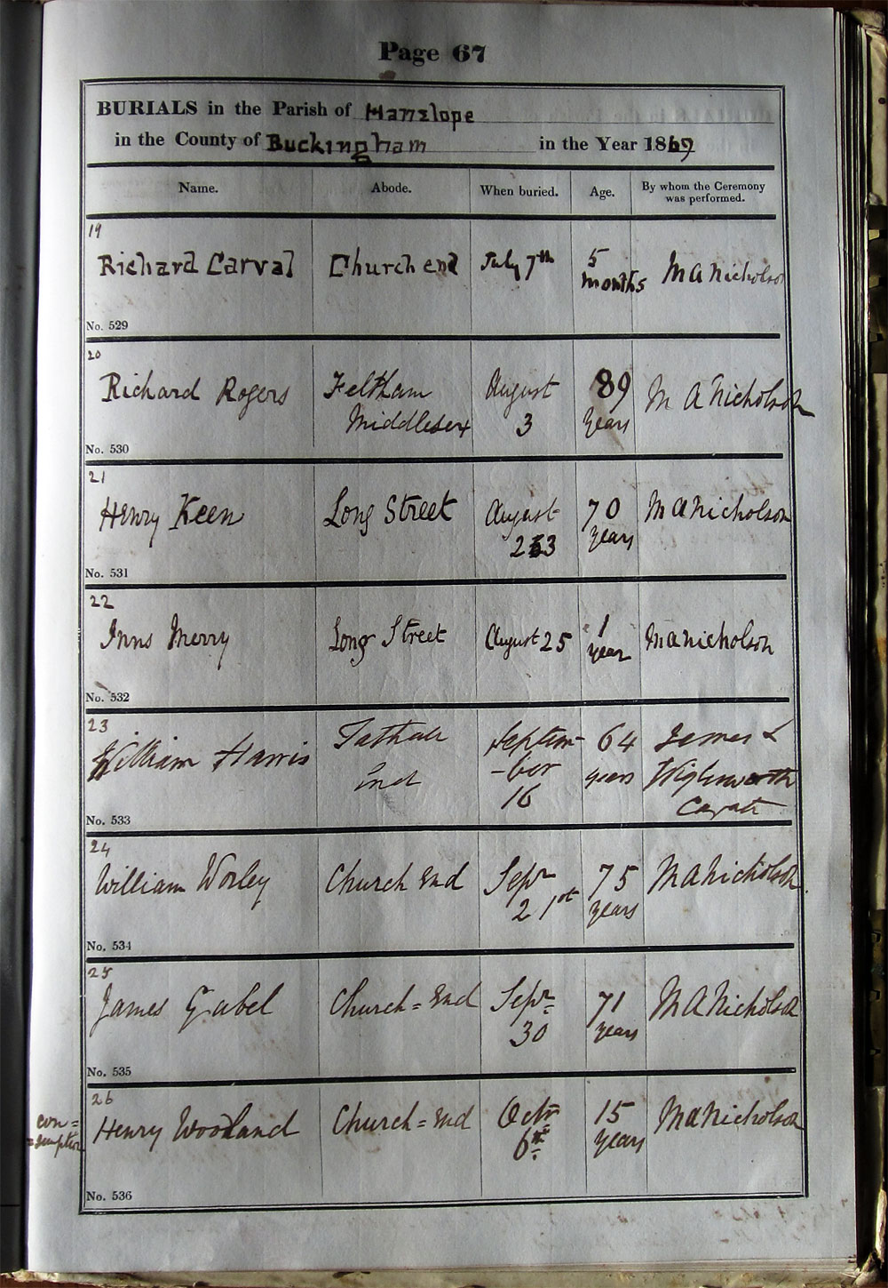 Below is a transcription and image of page 67 of the Burial register for 1853-1878 of St. James The Great, Hanslope |