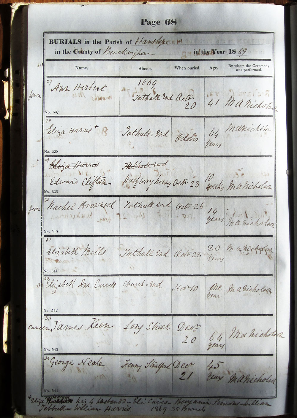 Below is a transcription and image of page 68 of the Burial register for 1853-1878 of St. James The Great, Hanslope