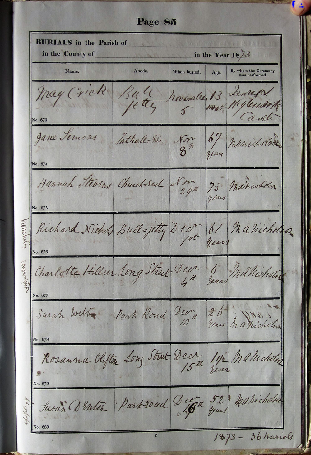 Below is a transcription and image of page 85 of the Burial register for 1853-1878 of St. James The Great, Hanslope |