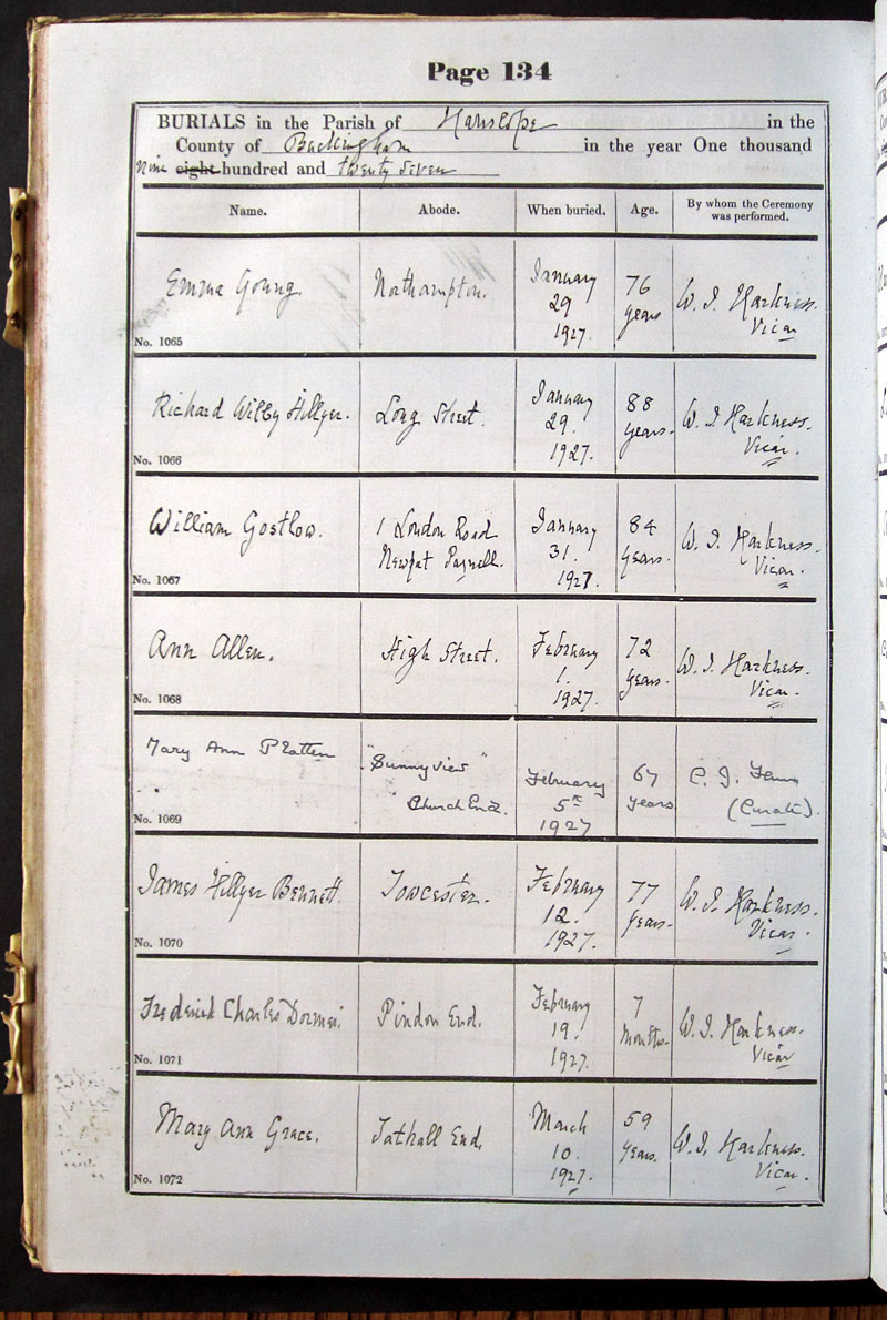 Below is a transcription and image of page 134 of the Burial register for 1878-1963 of St. James The Great, Hanslope