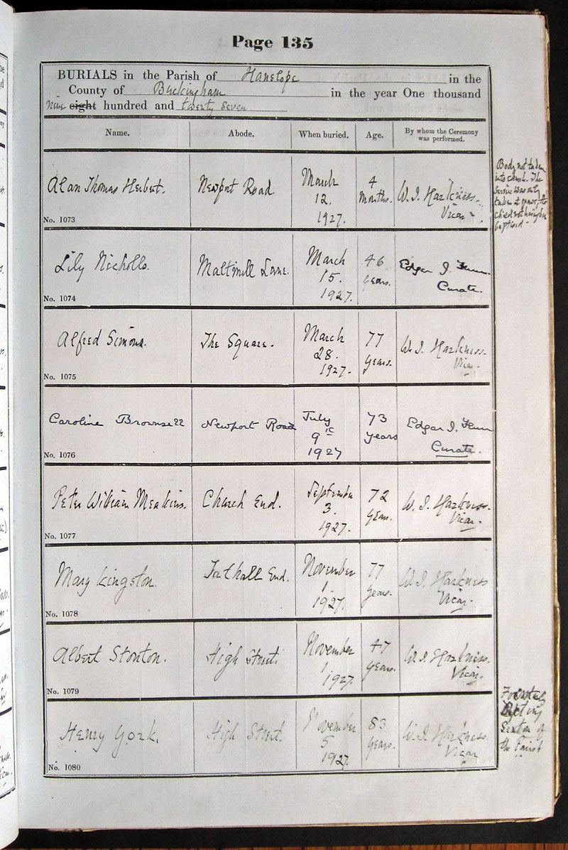 Below is a transcription and image of page 135 of the Burial register for 1878-1963 of St. James The Great, Hanslope |