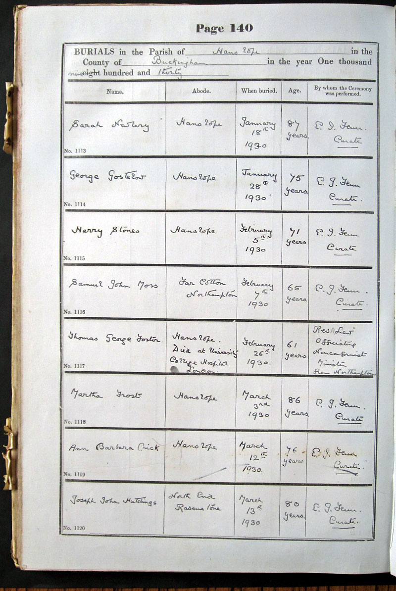 Below is a transcription and image of page 140 of the Burial register for 1878-1963 of St. James The Great, Hanslope |