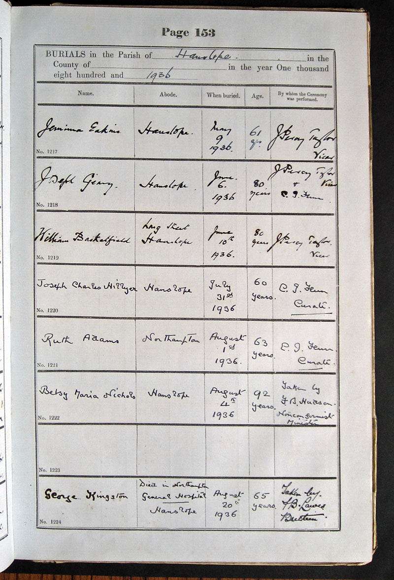 Below is a transcription and image of page 153 of the Burial register for 1878-1963 of St. James The Great, Hanslope