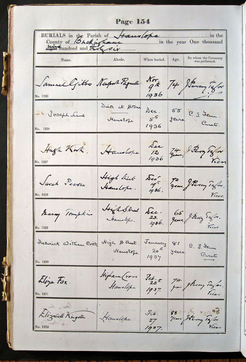 Below is a transcription and image of page 154 of the Burial register for 1878-1963 of St. James The Great, Hanslope |
