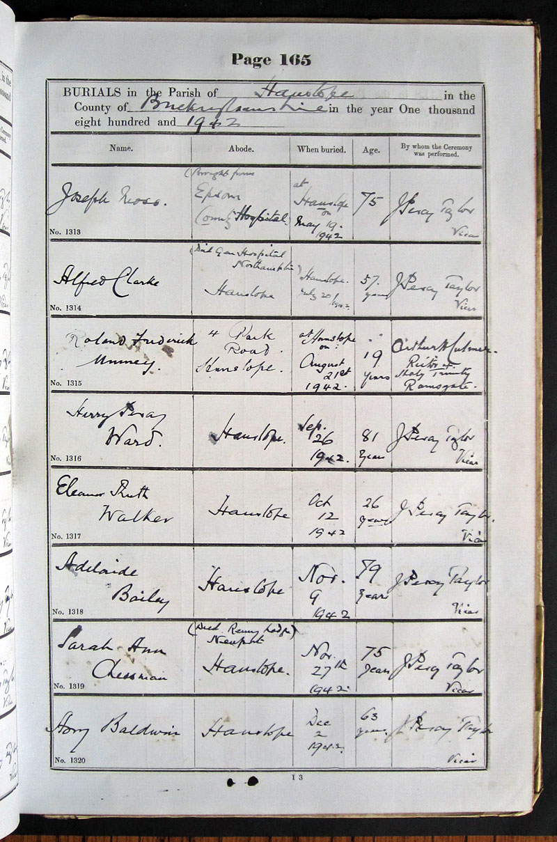 Below is a transcription and image of page 165 of the Burial register for 1878-1963 of St. James The Great, Hanslope