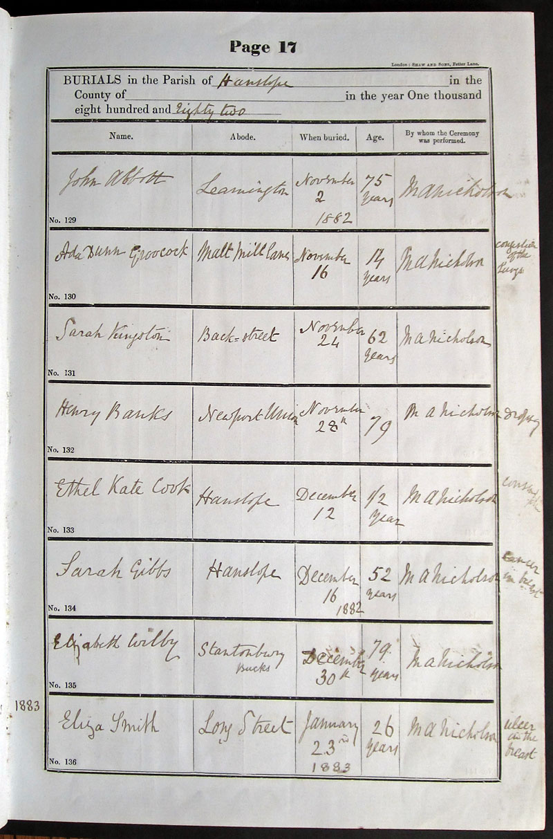 Below is a transcription and image of page 17 of the Burial register for 1878-1963 of St. James The Great, Hanslope |