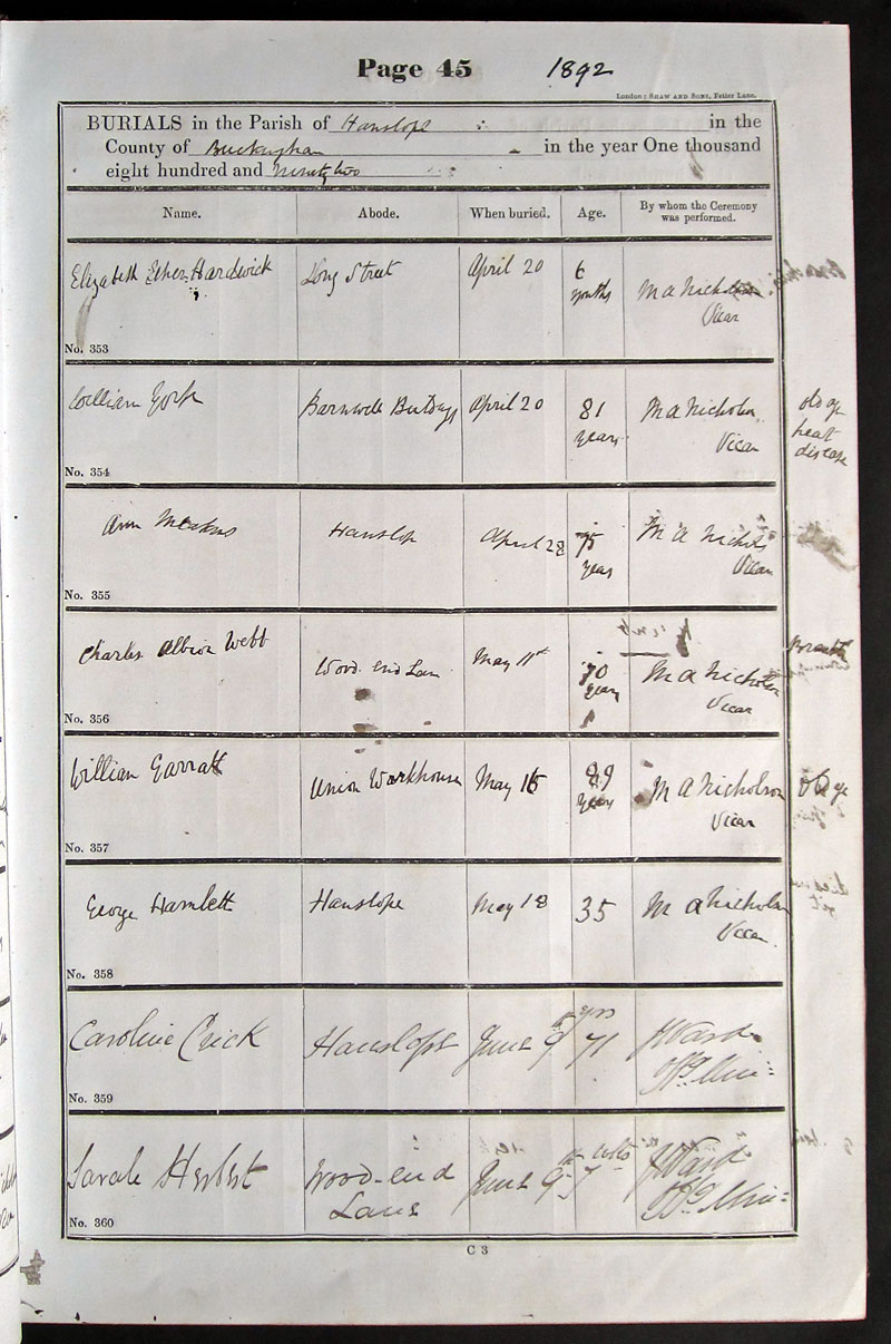 B U R I A L S in the Parish of .. Hanslope ..