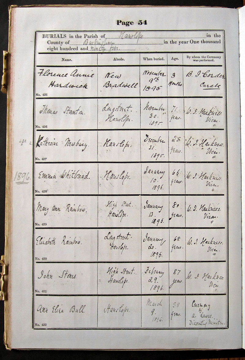 Below is a transcription and image of page 54 of the Burial register for 1878-1963 of St. James The Great, Hanslope |