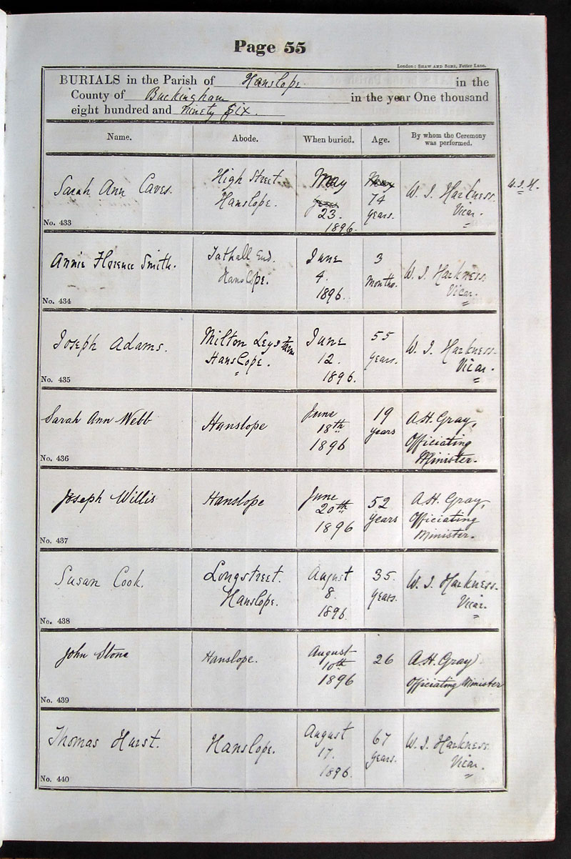 Below is a transcription and image of page 55 of the Burial register for 1878-1963 of St. James The Great, Hanslope