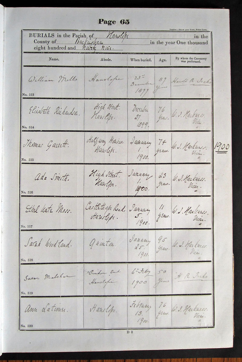 Below is a transcription and image of page 65 of the Burial register for 1878-1963 of St. James The Great, Hanslope |