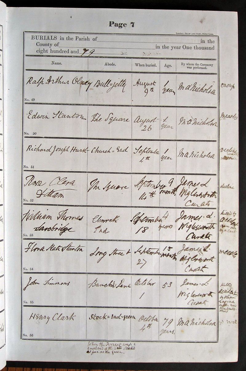 Comments in register: Killed accidentally by steam engine on the road near Watts Arms |