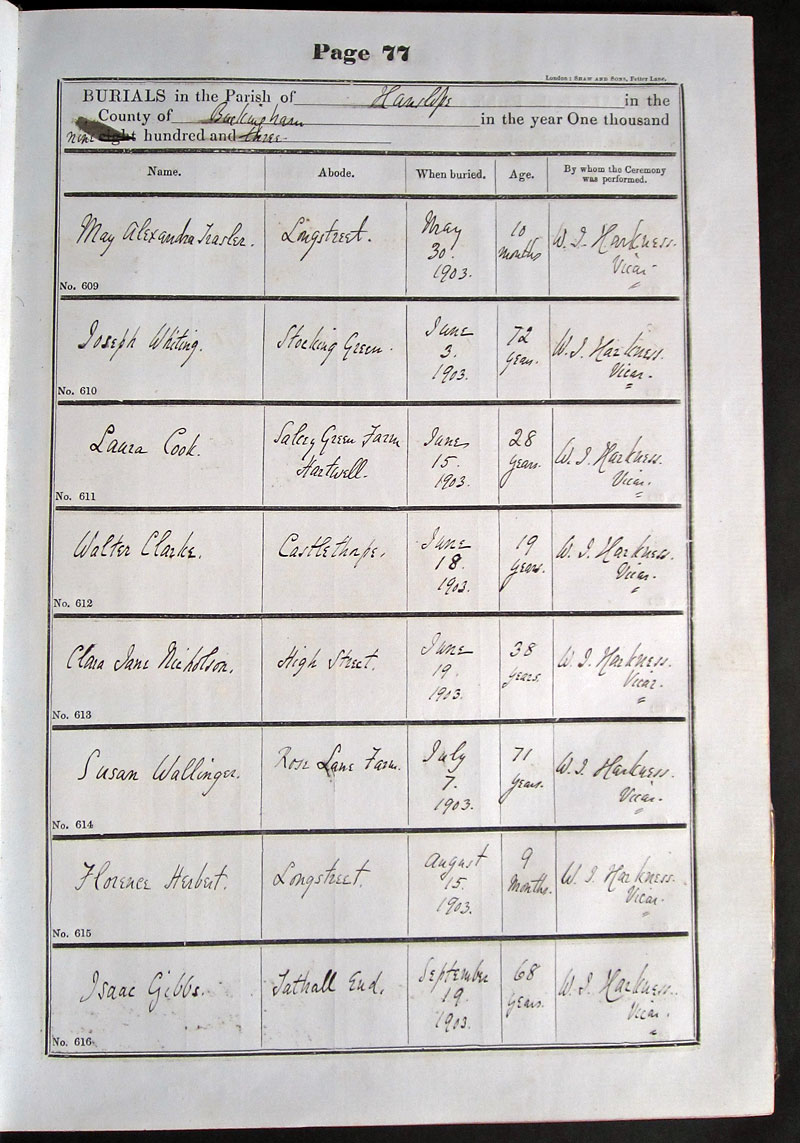 Below is a transcription and image of page 77 of the Burial register for 1878-1963 of St. James The Great, Hanslope |