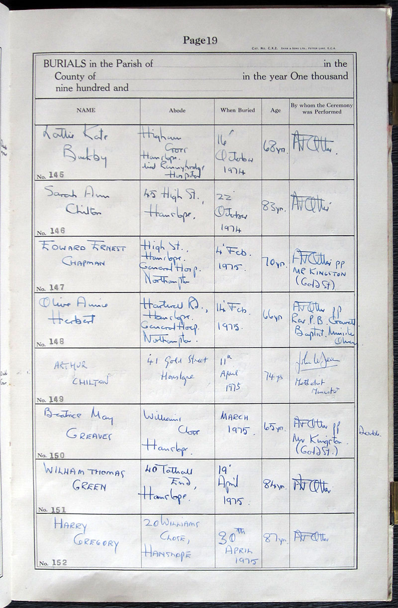 Lived at 22 Williams Close, died in The General Hospital, Northampton, buried on 13 March 1975. |
